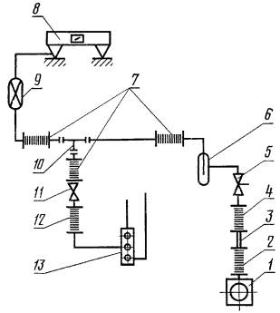 Примечания: 1. t1 - температура термического старения. 2. t1, t2, t3, … tn - продолжительности старения, при которых всех образцы обеспечивают герметичность системы: tn+1 - продолжительность старения, при которой один образец не обеспечивает герметичность системы; tn+1 - продолжительность старения, при которой два образца не обеспечивают герметичность системы. При этом t1 < t2 < t3 < … tn < tn+1 < tn+2. 3. Знак «+» означает, что образец обеспечивает герметичность системы; знак «-» - образец не обеспечивает герметичность системы. 5а.4.5 Разность tn+2 и tn+1 не должна превышать 10 % при продолжительности старения до 150 сут и 5 % - при продолжительности старения свыше 150 сут. Если разность tn+2 и tn+1 превышает указанные значения, испытания повторяют. 5а.4.6. Форма записи результатов испытания приведена в приложении 3. 5а.5. Обработка результатов 5а.5.1. За результат испытаний принимают максимальную продолжительность старения, при которой все испытуемые образцы обеспечивают герметичность системы. 5а.5.2. Сопоставимыми считают результаты испытаний, полученные на образцах, изготовленных одним способом при одинаковых условиях и продолжительности хранения, старение которых проводилось при одних и тех же значениях температуры. 5а.1-5а.5.1. (Введены дополнительно, Изм. № 1). 6. ТРЕБОВАНИЯ БЕЗОПАСНОСТИ6.1. Помещение для испытаний должно быть оборудовано приточно-вытяжной вентиляцией, и соответствовать требованиям ГОСТ 12.1.005 и ГОСТ 12.1.004. 6.2. Аппаратура должна соответствовать требованиям ГОСТ 12.1.019 и ГОСТ 12.1.030 в части требований электробезопасности. 6.3. При подготовке и проведении испытаний должны соблюдаться типовые правила пожарной безопасности для промышленных предприятий, утвержденные ГУПО МВД СССР, и соответствующие требованиям ГОСТ 12.3.002. 6.4. Не допускается производить ремонт включенной в сеть энергопитания аппаратуры. 6.1-6.4. (Измененная редакция, Изм. № 1). 6.5. При проведении испытаний на установке с источником ионизирующего излучения необходимо соблюдать требования, установленные Санитарными правилами устройства и эксплуатации мощных изотопных гамма-установок (№ 1170-74). Нормами радиационной безопасности (НРБ-76) и Общими санитарными правилами (ОСП-72/80). (Измененная редакция, Изм. № 1, 2). 6.6. Сосуд Дьюара должен быть обшит по всей длине плотной светлой тканью и находиться в тонкостенном металлическом сосуде, на дне которого помещено асбестовое волокно. Перед заполнением сосуда Дьюара жидким азотом необходимо пользоваться воронкой, изготовленной из картона, и защитными очками. 6.7. Каждый работающий на установке должен пройти инструктаж по технике безопасности и эксплуатации установки и получить допуск к работе. 6.8. На каждом рабочем участке должны быть инструкции по технике безопасности и промышленной санитарии, а также журнал проведения инструктажа работающих по установленной форме. 6.9. Все работающие должны быть в халатах и теплоизолирующих перчатках. 6.6-6.9. (Измененная редакция, Изм. № 1). ПРИЛОЖЕНИЕ 1Рекомендуемое СХЕМА СТРУБЦИНЫ