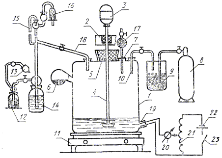 Массу образца устанавливают, исходя из того, что расход реактива Фишера для определения содержания воды должен быть от 3 до 8 см3. Для этого проводят предварительные испытания по определению этого расхода. 1.1.4. Взвешивают образцы на часовом стекле, определяют массу образцов mпм по разности масс часового стекла с навеской материала и чистого стекла, доведенного до постоянной массы сушкой при температуре (105 ± 2) °С. 1.2. Аппаратура, реактивы и растворы 1.2.1. Прибор для экстрагирования воды и измельчения образца материала в растворителе, обеспечивающий высокую степень измельчения образца в условиях, исключающих попадание атмосферной влаги в подготовленную пробу, а также обеспечивающий электрометрическое титрование воды реактивом Фишера. Рекомендуемая схема прибора приведена на черт. 1. Прибор для экстрагирования воды и измельчения образца материала в растворителе 1 - стеклянный сосуд для помола образцов, экстракции и титрования; 2 - штатив; 3 - мотор высокоскоростной мешалки; 4 - вал мешалки; 5 - пробка из нержавеющей стали или фторопласта 4; 6 - полая пробка на шлифе для внесение образца; 7 - штуцер для введения растворителя; 8 - баллон с азотом; 9 - осушитель азота; 10 - трубка для ввода сухого азота; 11 - платформа; 12 - осушительная склянка; 13 - резиновая груша; 14 - склянка с реактивом Фишера; 15 - микробюретка; 16, 17 - осушительные трубки; 18 - насадка с капилляром; 19 - электроды из платиновой фольги по ГОСТ 2401; 20 - микроамперметр на 100 мА; 21 - потенциометр сопротивления на 9 - 10 кОм; 22 -источник постоянного тока на 1,5 В; 23 - выключатель Черт. 1 Прибор состоит из стеклянного сосуда вместимостью 500 см3 и высокоскоростной мешалки с регулируемой скоростью вращения от 300 до 18000 мин-1. Вал мешалки и лопасти выполняют из металла, не реагирующего с реактивом Фишера. Лопасти мешалки выполняют в виде ножей. Вал мешалки проходит через отверстие в пришлифованной к сосуду пробке из нержавеющей стали или фторопласта 4, обеспечивающей герметичность затвора. Для предупреждения попадания в сосуд влажного воздуха в него под небольшим избыточным давлением (3 - 4 мм рт. ст.) с помощью баллона и осушителя подается сухой азот с расходом 10 - 15 см3/мин. Штуцер после подачи растворителя запирается осушительной трубкой на шлифе. Образец в виде навески подают в сосуд с помощью поворота полой пробки на шлифе. Воду, экстрагированную из образца, титруют с помощью микробюретки и насадки с капилляром. Точку эквивалентности определяют электрометрически с погрешностью не более ±5 % в диапазоне определения воды 0,0002 - 0,05 % и ±4 % в диапазоне определения воды 0,05 - 80 % (по массе). 1.2.2. Азот газообразный технический по ГОСТ 9293, предварительно осушенный пропусканием через колонки, наполненные силикагелем и ангидроном, с содержанием воды не более 5 мкг/г. 1.2.3. Вода дистиллированная по ГОСТ 6709. 1.2.4. Метанол-яд по ГОСТ 6995 с массовой долей воды не более 0,05 %. При большем содержании воды метанол обезвоживают следующим образом: в круглодонную колбу вместимостью 1 дм3, снабженную обратным холодильником с хлоркальциевой трубкой, помещают 5 г магния в стружке, 0,5 г йода и приливают 250 - 300 см3 метанола. Если водород при этом выделяется слабо, смесь слегка нагревают на водяной бане до полного растворения магниевых стружек. Через обратный холодильник приливают 500 - 600 см3 метанола и кипятят смесь в течение 30 мин. После этого метанол 