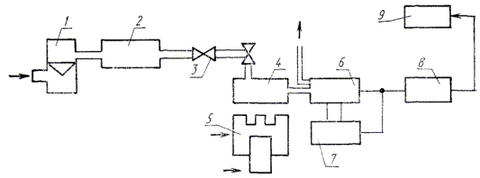 Вода, испаряемая из образца, находящегося в фарфоровой лодочке, помещенной в печь, с помощью газа-носителя поступает в электролитическую ячейку, состоящую из U-образной трубки с платиновыми электродами, между которыми помещена пленка пятиокиси фосфора (Р2О5) толщиной (0,5 ± 0,05) мм. При этом пятиокись фосфора, являющаяся диэлектриком, превращается в фосфорную кислоту, являющуюся проводником. К платиновым электродам подводят постоянное напряжение 50 - 60 В, в результате чего происходит разложение молекул воды на продукты электролитического разложения воды Н+ и О-. Принципиальная схема установки для анализа содержания влаги кулонометрическим методом 1 - расходомер газа-носителя; 2 - осушитель газа; 3 - редуктор; 4 - печь; 5 - нагреватель печи с регулятором температуры; 6 - электролитическая ячейка; 7 - источник питания электролитической ячейки; 8 - аналого-цифровой преобразователь; 9 - дисплей Черт. 2 2.2.1.2. Блок-схема аналого-цифрового преобразователя (АЦП), приведена на черт. 3. Аналого-цифровой преобразователь (АЦП) с дисплеем 1 - электролитическая ячейка; 2 - интегратор; 3 - конденсатор; 4 - разрядное устройстве 5 - компаратор; 6 - мультивибратор; 7 - тригер; 8 - цифровой дисплей; 9 - сопротивление Черт. 3 АЦП установки для определения количества воды кулонометрическим способом функционирует следующим образом: через электролитическую ячейку протекает ток, пропорциональный количеству поглощенной воды, испаренной из образца. Он создает на сопротивлении падение напряжения. В зависимости от количества воды и продолжительности ее разложения на конденсаторе интегратора образуется заряд, соответствующий количеству электричества, необходимого для разложения 0,1 мкг воды. Этот заряд формирует с помощью компаратора исходное напряжение прямоугольного вида для запуска мультивибратора. На выходе мультивибратора напряжение, полученное при разложении 0,1 мкг воды, формирует единичный импульс, который поступает как в счетчик дисплея 8, так и на тригер 7, управляющий транзистором разрядного устройства 4. Сразу же после единичного импульса конденсатор разряжается и готов принять новый заряд, эквивалентный следующей порции воды в количестве 0,1 мкг. 2.2.2. Весы лабораторные аналитические одноплечные с предельно допустимой погрешностью взвешивания ±0,00005 г. 2.2.3. Азот по п. 1.2.2. 2.2.4. Вода дистиллированная по ГОСТ 6709. 2.2.5. Фосфора пятиокись по ТУ 09-4173, х. ч. 2.2.6. Капилляры стеклянные с внутренним диаметром 0,03 - 0,04 мм, длиной (20 ± 1) мм. 2.2.7. Эксикатор по ГОСТ 25336. 2.3. Подготовка к испытаниям 2.3.1. Для проведения испытания составляют программу в соответствии с п. 1.3.1. 2.3.2. Установку для определения содержания воды в материале калибруют известным количеством воды. Для этого вместо образца в лодочку закладывают калиброванный капилляр, в котором содержится известное количество воды. 2.3.3. Лодочку для образцов предварительно тщательно моют и просушивают при температуре (150 ± 2) °С, взвешивают до достижения постоянной массы с точностью ±0,00005 г. Между взвешиваниями лодочку охлаждают в эксикаторе, на дно которого уложен слой пятиокиси фосфора толщиной 2 см. 2.3.4. Высушивают капилляр диаметром 0,03 - 0,04 мм, длиной 20 ± 1 мм до постоянной массы m1 в соответствии с п. 2.3.3. 2.3.5. Наполняют капилляр дистиллированной водой, протирают фильтровальной бумагой, пинцетом переносят на чашку аналитических весов и опре