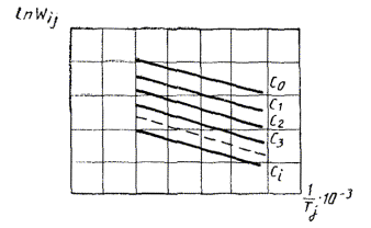 7.7 Антиоксидант, который при равных концентрациях его в материале и одинаковых условиях окисления (температура и давление) приводит к большему снижению скорости окисления или обеспечивает увеличение периода индукции, считают более эффективным. 7.8 Для дополнительной оценки эффективности выбранного по 7.7 антиоксиданта определяют изменения характерных показателей свойств стабилизированного материала по сравнению с нестабилизированным по соответствующей НТД. Если антиоксидант, введенный в материал, не снижает характерных показателей, его считают эффективным для стабилизации данного материала. 7.9 Для определения аналитической зависимости скорости окисления материала от температуры для каждой из концентраций антиоксиданта с использованием уравнения Аррениуса в соответствии с ГОСТ 9.707 вычисляют зависимость между скоростями окисления при различных температурах и заданном уровне изменения давления кислорода в системе по формуле где Wij - скорость окисления материала при температуре Tj и концентрации антиоксиданта Сi, моль/кг×с; где Wi(j+1) - скорость окисления материала при температуре Ti(j + 1) и концентрации антиоксиданта Сi, моль/кг×с; Ei - коэффициент температурной зависимости процесса окисления материала для каждой из концентрации антиоксиданта Сi, кДж/моль (ккал/моль); R - универсальная газовая постоянная, равная 8,314 Дж/моль×К (1,987 кал/моль×К). Зависимость (10) используют раздельно для температур испытаний выше и ниже температуры стеклования полимера. 7.10 Для вычисления Е по экспериментальным данным строят график зависимости логарифма скорости окисления (lnWij) от температуры для каждой из концентраций антиоксиданта, в том числе и для нестабилизированного материала (С = 0) (черт. 2). Черт. 2 7.11. Тангенс угла наклона зависимости (lnWij = f( tgai = где Wij - скорость окисления материала при каждой температуре испытаний и концентрации антиоксиданта, моль/кг×с; Тij - температура испытаний при каждой из концентраций антиоксиданта, К-. 7.12 Коэффициент температурной зависимости процесса окисления материала (Ei) для каждой концентрации (Сi) вычисляют по формуле
