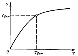 При линейной зависимости коррозионного эффекта от времени соответствующий скоростной показатель находят отношением изменения коррозионного эффекта за определенный интервал времени к величине этого интервала. При нелинейной зависимости коррозионного эффекта от времени соответствующий скоростной показатель коррозии находят как первую производную по времени графическим или аналитическим способом. 1.5. Показатели коррозионной стойкости, отмеченные в таблице знаком*, определяют из временной зависимости соответствующего интегрального показателя коррозии графическим способом, приведенным на схеме, или аналитически из его эмпирической временной зависимости у = f(t), находя для допустимого (заданного) значения удоп соответствующую величину tдоп. Показатели коррозионной стойкости при воздействии на металл механических факторов, в том числе остаточных напряжений, отмеченные в таблице знаком**, определяют непосредственно при коррозионных испытаниях. Схема зависимости коррозионного эффекта (интегрального показателя) у от времени