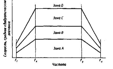 Рисунок 2 - Общий вид кривых для критерия на основе среднего квадратического значения виброскорости Если же для некоторой машины значительная часть вибрационной энергии сосредоточена за пределами диапазона частот fx… fy, возможны следующие решения: а) Помимо измерений виброскорости проводят измерения в широкой полосе частот виброперемещения (если основная часть энергетического спектра лежит ниже fх) или виброускорения (если основная часть энергетического спектра лежит выше fy). Допустимые значения параметров виброперемещения или виброускорения получают из рисунка 2, переводя значения виброскорости на краях кривых (т.е. в диапазонах .fl … fx, fy … fu) в постоянные значения виброскорости и виброускорения соответственно. Вибрацию можно считать допустимой, если она является таковой по всем критериям (перемещения, скорости и ускорения). б) С помощью анализатора спектра в спектре вибрации выделяют все мощные частотные составляющие и определяют для них значения виброперемещения, виброскорости и виброускорения. После этого на основе уравнения (А.2) рассчитывают эквивалентное значение параметра виброскорости; для частотных составляющих, лежащих ниже fx и выше fy, весовые коэффициенты берут в соответствии с рисунком 2. Окончательную оценку делают на основе сравнения со значениями границ в диапазоне fx … fy. Следует иметь в виду, что, кроме случая единственной доминирующей составляющей, непосредственное сравнение составляющих частотного спектра с границами, определяемыми кривыми на рисунке 2, приведет к ошибочным заключениям. в) Используют измерительный прибор, форма частотной характеристики которого в области, где сосредоточена вибрационная энергия машины, совпадает с формой кривых на рисунке 2. Окончательную оценку также делают на основе сравнения со значениями границ в диапазоне fx … fy. Дополнительное руководство по определению границ зон приведено в приложении В. Для машин некоторых типов, возможно, потребуется определение границ зон иных, чем те, что представлены на рисунке 2 (см., например, 6.5.3). 6.3 Критерий 2Данный критерий основан на оценке изменения значения параметра вибрации по сравнению с предварительно установленным эталонным значением в установившемся режиме работы машины. Значительные изменения (увеличение или уменьшение) значения параметра широкополосной вибрации могут потребовать принятия определенных мер даже в том случае, когда граница зоны С в соответствии с критерием 1 еще не достигнута. Такие изменения могут иметь внезапный характер или постепенно нарастать во времени и указывают на возможное возникновение повреждения машины в начальной стадии или другие неполадки. При использовании критерия 2 важно, чтобы измерения значений параметров вибрации, подлежащие впоследствии сравнению, проводили при одних и тех же положении и ориентации преобразователя вибрации и приблизительно в одном и том же режиме работы машины. Необходимо определить очевидные изменения значения параметра вибрации независимо от его общего значения, чтобы предотвратить возникновение опасной ситуации. Насколько данное изменение является значительным, должно быть определено в соответствующих стандартах на машины конкретных типов. Следует иметь в виду, что некоторые существенные изменения в состоянии машины могут быть обнаружены тол