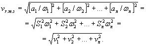Значения вибрационного ускорения, скорости или перемещения (соответственно aj, vj, Sj, j = 1, 2, …, n) определяют в результате анализа вибрационных спектров как функции угловой частоты (ω1, ω2, ..., ωn). Если известны средние квадратические значения амплитуд виброскорости v1, v2, ..., vn или средние квадратические значения амплитуд ускорения a1, a2, … ап, то связанное с ними и характеризующее колебательный процесс среднее квадратическое значение виброскорости определяется выражением
