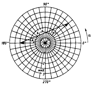 Рисунок Г.1, представляющий собой график в полярных координатах, используется для одновременного представления модуля и фазы одной из частотных составляющих сложного вибрационного сигнала в векторной форме. Вектор А1 соответствует исходному установившемуся вибрационному состоянию машины, характеризуемому средним квадратическим значением виброскорости 3 мм/с и фазовым утлом 40°. Вектор А2 соответствует установившемуся вибрационному состоянию после некоторых изменений состояния машины и определяется средним квадратическим значением виброскорости 2,5 мм/с при фазовом угле 180°. Из рисунка Г.1 видно, что хотя среднее квадратическое значение виброскорости уменьшилось на 0,5 мм/с, истинное изменение вибрации характеризуется вектором (А2 - A1), модуль которого равен 5,2 мм/с, что в 10 раз больше того значения, которое получается при сравнении абсолютных значений вибрации.