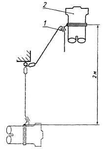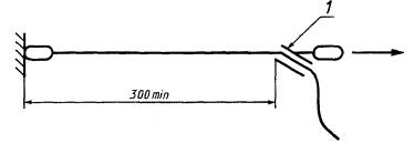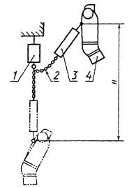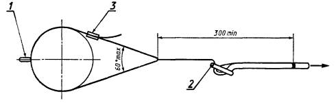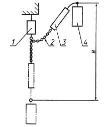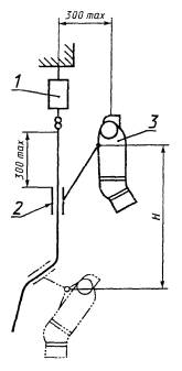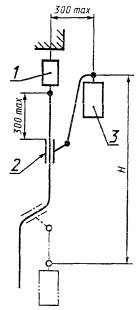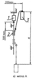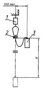 1 - датчик устройства для измерения силы; 2 - СИЗ от падения; 3 - груз массой 100 кг Рисунок 8 - Испытания динамических характеристик средств защиты от падения ползункового типа на жесткой анкерной линии 5.6.2.1.3 Поднимите груз так высоко над средством защиты от падения, насколько позволяют строп и соединительные элементы при максимальном отклонении по горизонтали от анкерной линии в 300 мм, закрепите его с помощью расцепляющего устройства. 5.6.2.1.4 Дайте грузу упасть и измерьте максимальное значение силы, измерьте расстояние Н по вертикали между элементом крепления груза до падения и после падения, когда груз находится в покое. 5.6.2.2 Метод испытания Б В этом методе испытания максимальная общая длина датчика устройства для измерения силы должна быть не более 100 мм. 5.6.2.2.1 Закрепите жесткую анкерную линию согласно инструкциям изготовителя. 5.6.2.2.2 Прикрепите средство защиты от падения с помощью его стропа и соединительных элементов через датчик устройства для измерения силы к грузу массой 100 кг. 5.6.2.2.3 В положении, когда средство защиты от падения находится на середине между верхним и промежуточным анкером (рисунок 8 б), поднимите груз так высоко над средством защиты от падения, насколько позволяют строп, датчик устройства для измерения силы и соединительные элементы. При максимальном горизонтальном отклонении от анкерной линии 300 мм поднимите груз и закрепите его с помощью расцепляющего устройства. 5.6.2.2.4 Дайте грузу упасть и измерьте максимальное значение силы в процессе падения. Измерьте расстояние Н по вертикали между элементами крепления груза до и после падения. 5.6.3 Оборудование для испытания статической нагрузкой Оборудование должно соответствовать требованиям 4.1. 5.6.4 Метод испытания статической нагрузкой СИЗ от падения ползункового типа на жесткой анкерной линии Приложите статическую нагрузку между закрепленным концом жесткой анкерной линии и средством защиты через строп и соединительные элементы (включая соединение, если анкерная линия представляет собой рельс) таким образом, чтобы нагрузка была приложена одновременно ко всем элементам системы. 1 - датчик устройства для измерения силы; 2 - зажим; 3 - груз массой 100 кг Рисунок 9 - Испытания динамических характеристик СИЗ от падения типа рулетки 5.7 СИЗ от падения типа рулетки 5.7.1 Оборудование для испытания динамических характеристик Оборудование должно соответствовать требованиям 4.4 - 4.6. 5.7.2 Метод испытания динамических характеристик 5.7.2.1 Прикрепите верхнюю часть СИЗ от падения к жесткой анкерной точке последовательно с датчиком устройства для измерения силы, как показано на рисунке 9. 5.7.2.2 Вытяните строп на 600 мм от СИЗ от падения и укрепите зажимом так, чтобы предотвратить его втягивание. Прикрепите груз массой 100 кг. Поднимите груз так, чтобы его элемент крепления находился на одной горизонтальной линии с зажимом. Отклонение по горизонтали груза от вертикальной оси СИЗ не должно быть более 300 мм. Закрепите груз с помощью расцепляющего устройства. 5.7.2.3 Дайте грузу упасть и измерьте максимальную силу. Измерьте расстояние Н по вертикали между точками прикрепления груза до и после падения, когда груз находится в покое. Если в СИЗ входит индикатор падения, то убедитесь, что все действия с ним проводятся в соответствии с инструкцией изготовителя. 5.7.3 Оборудование для испытания стати