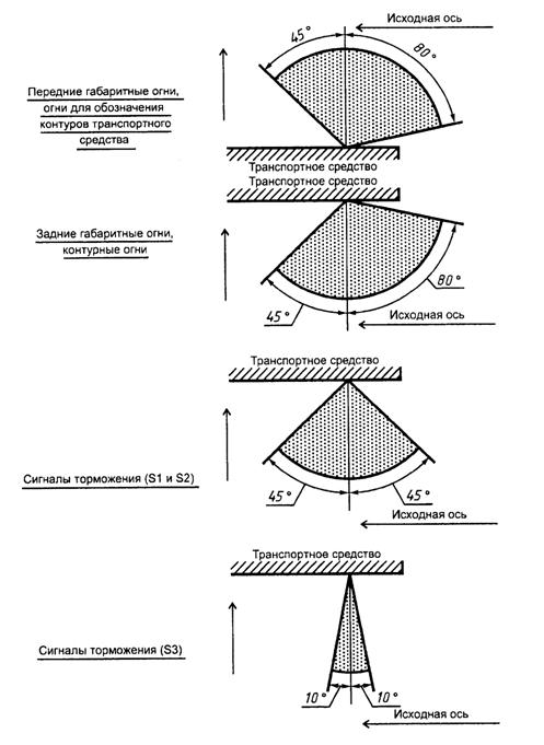 Дата введения 2000-07-01 Настоящий стандарт вводит в действие Правила ЕЭК ООН № 7 (далее - Правила). 1. ОпределенияВ настоящих Правилах применяют следующие термины с соответствующими определениями. 1.1 передний габаритный огонь: Огонь, предназначенный для сигнализации наличия и габаритной ширины транспортного средства спереди; 1.2 задний габаритный (боковой) огонь: Огонь, предназначенный для сигнализации наличия и габаритной ширины транспортного средства сзади; 1.3 сигнал торможения: Огонь, предназначенный для подачи другим участникам дорожного движения, находящимся сзади транспортного средства, сигнала о том, что водитель привел в действие рабочий тормоз. Сигналы торможения могут включаться посредством использования замедлителя или аналогичного устройства; 1.4 контурный огонь: Огонь, установленный вблизи крайних внешних углов и как можно ближе к высшей точке транспортного средства и предназначенный для ясного обозначения габарита транспортного средства по ширине. На некоторых автотранспортных средствах и прицепах эти огни предназначаются для дополнения габаритных (боковых) огней транспортного средства и привлечения особого внимания к его контурам; 1.5 передние габаритные огни и задние габаритные (боковые) огни, сигналы торможения и огни для обозначения контуров различных типов: Огни, которые отличаются в каждой из указанных категорий по таким основным элементам, как: - торговая или фабричная марка; - характеристики оптической системы (уровни силы света, углы распределения света, тип ламп накаливания и т.д.); - система уменьшения освещенности в ночное время в отношении сигналов торможения с двумя уровнями силы света. 1.6 Остальные термины и определения - по Правилам ЕЭК ООН № 48. 2. Заявка на официальное утверждение2.1 Заявка на официальное утверждение представляется владельцем фабричной или торговой марки или его надлежащим образом уполномоченным представителем. В ней должны быть указаны: 2.1.1 функция или функции, для которых предназначается представляемое для официального утверждения устройство и может ли оно использоваться также в сочетании двух огней одного и того же вида (типа); 2.1.2 в случае контурного огня - предназначается ли он для излучения белого или красного света; 2.1.3 в случае передних габаритных огней или задних габаритных (боковых) огней - предназначены ли они для излучения белого, селективного желтого или красного света. 2.2 Для каждого типа устройств к заявке должны быть приложены: 2.2.1 чертежи в трех экземплярах, достаточно подробные для того, чтобы можно было идентифицировать тип устройства, и указывающие геометрические условия монтажа на транспортном средстве, а также ось наблюдения, которая принимается при испытаниях в качестве исходной оси (горизонтальный угол Н = 0°, вертикальный угол V = 0°), и точку, которая принимается при испытаниях в качестве исходного центра. На чертежах должно быть указано место, предназначенное для номера официального утверждения и дополнительных знаков относительно круга знака официального утверждения; 2.2.2 краткое техническое описание, в котором, за исключением ламп с несменными источниками света, указывается, в частности, категория или категории предписываемых ламп накаливания; эта категория ламп накаливания должна входить в число категорий, предусмотренных в Правилах ЕЭК ООН 