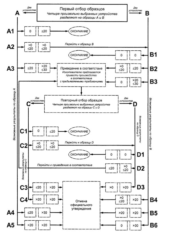 Если в ходе определенного типа испытания выявляется несоответствие каких-либо отобранных образцов, то отбираются и испытываются новые образцы. Предприятие-изготовитель принимает меры для обеспечения соответствия данного производства.