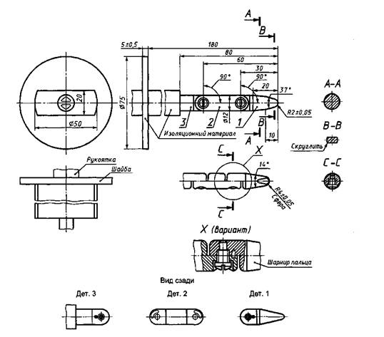Перед вводом в зажим проволоки проводника соответственно формуют. Проводник вводят в вывод до упора в его дно или до появления конца проводника с противоположной стороны вывода, в положении, когда существует наибольшая вероятность выскальзывания проволоки. Затем затягивают зажимной винт или гайку с приложением крутящего момента, равного двум третям указанного в соответствующей графе таблицы 9. После испытания ни одна проволока проводника не должна оказаться вне зажима. 8.6 Проверка защиты от поражения электрическим токомАВО предназначен для встраивания в оборудование (например, в электроприбор). Поэтому это испытание не может быть выполнено на автономном АВО, если не ограничены поверхности возможного прикосновения к нему в установленном положении согласно инструкциям изготовителя. Испытание выполняют с применением стандартного испытательного пальца, изображенного на рисунке 7, на тех частях АВО, которых можно касаться в установленном положении. АВО оснащен проводниками наименьшего и наибольшего поперечного сечений из указанных в таблице 2. Стандартный испытательный палец должен быть спроектирован так, чтобы каждая его шарнирная секция могла поворачиваться под углом 90° к оси пальца только в одном направлении. Испытательный палец прикладывают в любом изогнутом положении, возможном для настоящего пальца, и индикатор электрического контакта сигнализирует о прикосновении к частям, находящимся под напряжением. Для индикации контакта рекомендуется использовать лампочку на напряжение не менее 40 В. 8.7 Проверка электроизоляционных свойств8.7.1.1 Подготовка АВО к испытанию Испытанию следует подвергать АВО без любой оболочки. Если в особых случаях применяют неотъемлемую оболочку, тогда кабельные вводы, если они есть, оставляют открытыми, если предусмотрены пробиваемые диафрагмы, одну из них вскрывают. Примечание - Термин «неотъемлемая оболочка» означает, что АВО не может нормально функционировать без этой оболочки. Части, которые можно снять без применения инструмента, снимают и подвергают влажной обработке вместе с главной частью; пружинные крышки на время этой обработки открывают. 8.7.1.2 Условия испытания Влажную обработку выполняют в камере с относительной влажностью воздуха от 91 до 95 %. Температура воздуха, в котором испытывают образец, поддерживают с погрешностью ±1 "Сна любом удобном значении Т от 20 до 30 °С. Перед тем как поместить образец в камеру влаги, его доводят до температуры от Т до (Т+4) °С. 8.7.1.3 Методика испытания Образец выдерживают в камере 48 ч. Примечание - Относительную влажность 91-95 % можно обеспечить, поместив в камеру влаги насыщенный раствор сульфата натрия (Na2S04) или нитрата калия (KNO3) в воде с достаточно большой поверхностью контакта с воздухом. Для достижения в камере предписанных условий необходимы постоянная циркуляция в ней воздуха и, главное, использование камеры с теплоизоляцией. 8.7.1.4 Состояние АВО после испытания После такой обработки образец не должен иметь повреждения согласно требованиям настоящего стандарта, и должен выдержать испытания по 8.7.2 и 8.7.3. 8.7.2 Сопротивление изоляции главной цепи После обработки АВО согласно 8.7.1 в течение 5 с после приложения напряжения постоянного тока ≈ 500 В измеряют сопротивление изоляции в такой последовательности: а) при разомкнутом АВО - между каждой паро
