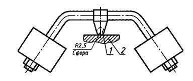 1 - стальной шарик; 2 – образец Рисунок 8 - Устройство для испытания шариком
