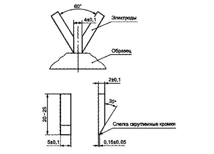 течение 30 с после удаления раскаленной проволоки. Примечание - Решается вопрос о пересмотре этого испытания. 8.16 Испытание трекингостойкостиСоответствие требованию 7.11 проверяют для материалов, кроме керамики, следующим испытанием. Плоскую поверхность испытуемой части, если возможно, размером не менее 15×15 мм помещают в горизонтальное положение. Два платиновых электрода, размеры которых указаны на рисунке 9, помещают на поверхности образца, как показано на рисунке, так что скругленные края соприкасаются с образцом по всей их длине. Усилие от каждого электрода, действующее на поверхность, составляет ≈ 1 Н. Электроды подсоединяют к источнику питания частотой 50 Гц, напряжение которого соответствует СИТ материала (см. таблицу 1), например 100, 400 или 600 В практически синусоидальной формы. Полное сопротивление цепи при накоротко замкнутых электродах регулируют при помощи сопротивления так, чтобы ток составлял (1,0±0,1)А при коэффициенте мощности от 0,9 до 1. В цепь включают реле максимального тока с временем расцепления не менее 0,5 с. Поверхность образца смачивают свободно падающими по центру между электродами каплями раствора хлористого аммония в дистиллированной воде. Раствор имеет удельное сопротивление 400 Ом·см при температуре 25°С, что соответствует концентрации ≈ 0,1 %. Капли имеют объем 20+5 мм3 и падают с высоты 30-40 мм. Интервал между падением капель составляет (30±5) с. До тех пор, пока не упадут все 50 капель, не должно произойти перекрытий или пробоев между электродами. Примечание - До начала каждого испытания необходимо проверить, чтобы электроды были чистыми, правильной формы и правильно установлены. В случае сомнения испытание можно повторить при необходимости на новом комплекте образцов. 8.17 Испытание на коррозионную стойкостьС подлежащих испытанию частей полностью удаляют смазку путем их погружения в холодный химический обезжиривающий реагент типа метилхлороформа или очищенного бензина на К) мин, а затем еще на 10 мин в 10 %-ный раствор хлористого аммония в воде температурой (20±5) °С. После стряхивания капель без высушивания эти части на 10 мин помещают в камеру с насыщенным влагой воздухом при температуре (20±5)°С. После высушивания этих частей в течение 10 мин в камере нагрева при температуре (100+5)°С на их поверхности не должно быть признаков ржавчины. Следами ржавчины на острых кромках или желтоватой пленкой, удаляемой простым стиранием, можно пренебречь. Для небольших пружин, аналогичных деталей и недоступных частей, подверженных абразивному износу, достаточную защиту от коррозии может обеспечить слой смазки. Такие части подлежат этому испытанию только при возникновении сомнений относительно эффективности смазочной пленки, и в этом случае испытание проводят без предварительного обезжиривания. Примечание - При употреблении предписанной для испытания жидкости необходимо принять достаточные меры предосторожности во избежание вдыхания паров. Рисунок 1 – Самонарезающий формующий винт Рисунок 2 – Самонарезающий режущий винт S - источник питания; N - нейтраль; Z - импедансы, позволяющие получить ожидаемый ток, равный наибольшей отключающей способности; Z1 - импедансы для получения испытательных токов до уровня ниже номинальной наибольшей отключающей способности; R1 - сопротивление, проводящее ток до 10 А на фазу; Е- оболочка или оп