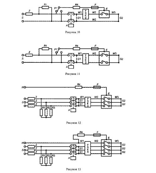 Рисунок 9 - Монтаж и размеры электродов для испытания на трекингостойкость S - источник питания; N - нейтраль; Е - панель или внешняя оболочка; Z - полные сопротивления для настройки контура на токи короткого замыкания ниже номинальной отключающей способности; А - вспомогательный выключатель с синхронизацией по волне напряжения; R1, R2, RЗ - сопротивления, проводящие ток до 10 А на фазу; R4 - сопротивление величиной 0,5 Ом; Р - селекторный переключатель; F- медная проволочка (диаметр 0,1 мм, длина 50 мм); G1 - соединения из проводников малого сопротивления для настройки контура перед испытанием; G2 - соединения из проводников малого сопротивления; W1 - проводники длиной по 0,75 м каждый и сечением в зависимости от номинала УЗКЗ; W2 - проводники длиной по 0,75 м каждый и сечением в зависимости от номинала АВО Рисунки 10-13 - Цепи для испытаний на короткое замыкание ПРИЛОЖЕНИЕ А