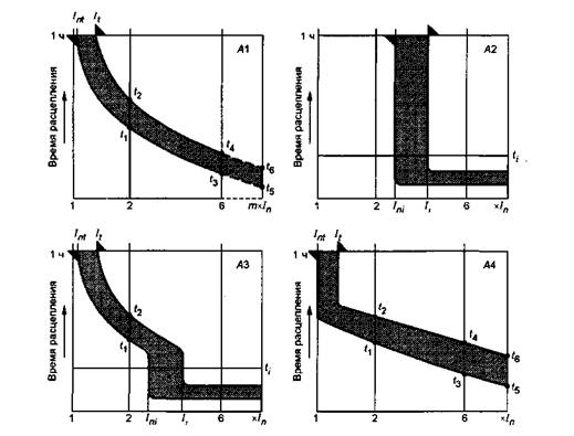 АВО не должен иметь повреждений, препятствующих его функционированию и дальнейшей эксплуатации. 7.3.2 Температура окружающего воздухаПревышения температуры, указанные в таблице, действительны только при условии, что температура окружающего воздуха не выходит за пределы, установленные в 6.1. 7.4 Электроизоляционные свойстваАВО должен быть способен выдерживать испытания, указанные в 8.7. После испытаний по 8.11 АВО должен выдержать испытание по 8.7.3, но с пониженным испытательным напряжением (см. 8.11.1.3) и без предварительного воздействия влажности по 8.7.1. 7.5 Условия для автоматического оперирования7.5.1 Стандартная время-токовая зонаЗона срабатывания (см. 2.5.11) обозначается изготовителем в информационных материалах (см. приложение А). Она определяется контрольными условиями, указанными в 8.2. Примечание - Характеристика расцепления АВО должна обеспечивать эффективную защиту электрооборудования без преждевременного срабатывания. Зона срабатывания АВО должна указываться для одного АВО без оболочки, установленного в неподвижном воздухе. Примечание - Условия температуры и установки, отличающиеся от контрольных (тип оболочки, установка нескольких АВО в одной оболочке и т.д., могут повлиять на зону срабатывания АВО. Изготовитель должен быть готов указать характеристики, соответствующие заданным температурам окружающего воздуха, отличающимся от стандартной контрольной температуры окружающего воздуха (23±2) °С и предоставить информацию об изменениях характеристики расцепления вследствие отклонений от других контрольных условий, например для установки не в вертикальной плоскости. Зона срабатывания представлена на рисунках A.1 - A.4 приложение А. Для АВО с тепловым, тепло-электромагнитным или гидравлически электромагнитным расцепителем изготовитель должен указать следующие значения: - испытательные токи, приведенные в таблице 5, как кратность номинального тока (mIn); - время (t1 - t6), указанное в таблице 5, где это необходимо. Примечание - Значения для АВО с электронно-комбинированным расцепителем - в стадии рассмотрения. Таблица 5 - Время-токовые характеристики срабатывания