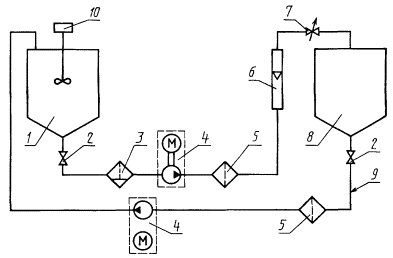 1 - расходный бак; 2, 7 - краны; 3 - испытуемый фильтр; 4 - насос; 5 - технологический фильтр; 6 - ротаметр; 8 - вспомогательный бак; 9 - соединительные трубы; 10 - мешалка ПРИЛОЖЕНИЕ 10(справочное)Схема стенда для определения коэффициента отсева фильтрации