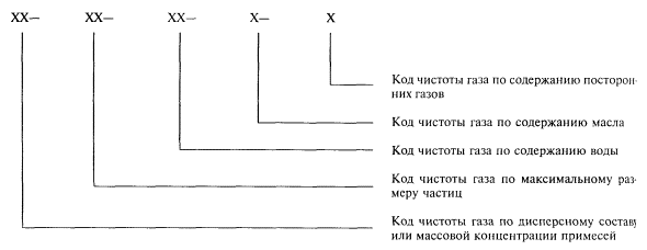 8 В газе независимо от класса чистоты, если он не кодирован по пункту 7, допускаются только следы кислот и щелочей. 9 Классы промышленной чистоты указывают в НТД и технической документации на газовые среды, используемые при производстве, ремонте и эксплуатации машин и приборов, в НТД и технической документации на машины и приборы и записывают в виде кода, структура которого приведена ниже. При обозначении класса чистоты газа используется параллельный метод кодирования. Структура кода класса промышленной чистоты газов