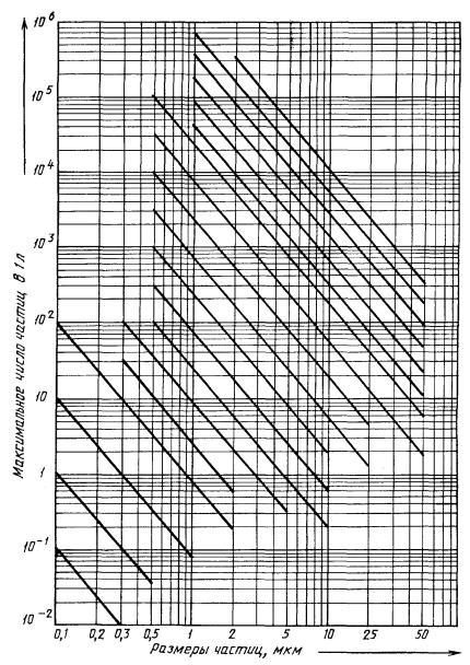В случае отсутствия необходимости устанавливать показатели по таблицам 4 - 7 вместо кода ставят знак «X». Если знаки оказываются в крайней правой позиции, их допускается опускать. Примеры обозначения классов чистоты газа: 1 Сборку агрегатов производить в помещении с классом чистого воздуха 06 по ГОСТ Р 50555-93. Воздух производственного помещения с дисперсным составом загрязнителя по классу 06 (см. таблицу 1), максимальный размер частиц, содержание воды, масла и посторонних газов не устанавливается. 2 Азот кл. 05-ХХ-04-1-4 ГОСТ Р 50555-93. Азот с содержанием механических частиц по классу 05 (см. таблицу 1), максимальный допустимый размер частиц дополнительно не устанавливается, температура точки росы минус 60 ºС, масло отсутствует, суммарное содержание посторонних газов не более (10-5) %. 10 Графическая интерпретация классов по таблицам 1 и 2 приведена на чертеже. 11 Определение количества частиц размером свыше указанного в таблицах 1 и 2 производят по графику, приведенному на чертеже. Например: количество частиц размером более 0,4 мкм в 04-м классе - 5 шт. 12 При необходимости возможно назначение промежуточного класса, который может отличаться от приведенного в таблицах 1 и 2 и на чертеже количеством частиц в их размерных группах. Пример. Необходимо назначить класс чистоты воздуха, в котором должно содержаться количество частиц загрязнителя не более указанного в таблице 8. Таблица 8