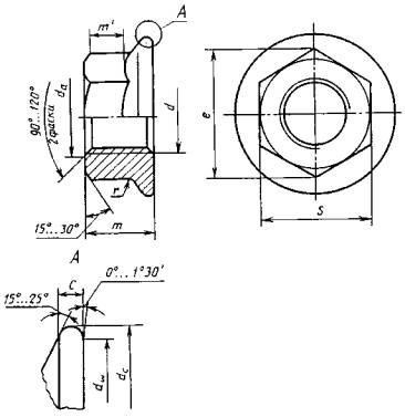 Дата введения 1995-01-01 Предисловие 1 ПОДГОТОВЛЕН И ВНЕСЕН ТК 229 «Крепежные изделия» 2 УТВЕРЖДЕН И ВВЕДЕН В ДЕЙСТВИЕ Постановлением Госстандарта России от 8 сентября 1993 г. № 205 3 Настоящий стандарт полностью соответствует международному стандарту ИСО 4161-83 «Гайки шестигранные с фланцем. Класс точности А» 4 ВВЕДЕН ВПЕРВЫЕ 5 ПЕРЕИЗДАНИЕ Содержание 1 Область примененияНастоящий стандарт распространяется на шестигранные гайки с фланцем с номинальным диаметром резьбы от 5 до 20 мм. 2 Нормативные ссылкиВ настоящем стандарте использованы ссылки на следующие стандарты: ГОСТ 9.301-86 Единая система защиты от коррозии и старения. Покрытия металлические и неметаллические неорганические. Общие требования ГОСТ 9.303-84 Единая система защиты от коррозии и старения. Покрытия металлические и неметаллические неорганические. Общие требования к выбору ГОСТ 1759.0-87 Болты, винты, шпильки и гайки. Технические условия ГОСТ 1759.1-82 Болты, винты, шпильки, гайки и шурупы. Допуски. Методы контроля размеров и отклонений формы и расположения поверхностей ГОСТ 1759.3-83 Гайки. Дефекты поверхности и методы контроля ГОСТ 1759.5-87 Гайки. Механические свойства и методы испытаний ГОСТ 16093-2004 (ИСО 965-1:1998, ИСО 965-3:1998) Основные нормы взаимозаменяемости. Резьба метрическая. Допуски. Посадки с зазором ГОСТ 17769-83 Изделия крепежные. Правила приемки ГОСТ 18160-72 Изделия крепежные. Упаковка. Маркировка. Транспортирование и хранение ГОСТ 24705-2004 (ИСО 724:1993) Основные нормы взаимозаменяемости. Резьба метрическая. Основные размеры 3 РазмерыКонструкция и размеры гаек должны соответствовать указанным на рисунке 1 и в таблице 1.