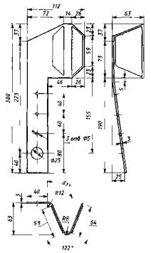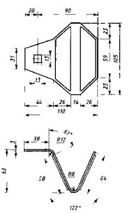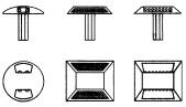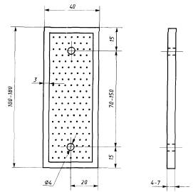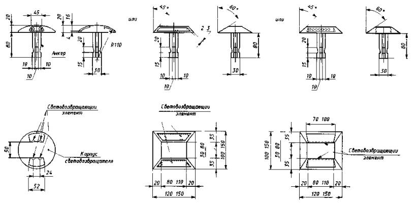Рисунок 5 - Световозвращатели типа КД4. Разновидность КД4-2 5 ТЕХНИЧЕСКИЕ ТРЕБОВАНИЯ5.1 Требования к конструкции 5.1.1 Световозвращатели следует изготавливать в соответствии с требованиями настоящего стандарта по рабочим чертежам, утвержденным в установленном порядке. 5.1.2 Конструктивно световозвращающие элементы могут быть выполнены с применением плоскогранных оптических элементов отдельных шаров или пленок со световозвращающей поверхностью. 5.1.3 Рабочие поверхности оптических элементов должны быть изолированы от воздействия внешней среды с помощью герметичного корпуса или защитного покрытия. 5.1.4 Лицевая поверхность световозвращателя должна быть гладкой обеспечивающей удаление с нее пыли и грязи во время мойки. 5.1.5 На световозвращателях допускается наличие кромок шириной не более 5 мм, охватывающих световозвращающий элемент. 5.1.6 Корпуса световозвращателей, кроме типа КД4, должны быть изготовлены из пластмассы. Корпуса световозвращателей типа КД4 изготавливают из стали в соответствии с действующей документацией на изготовление дорожных ограждений. Для дорог, зимнее содержание которых осуществляют с использованием плужных снегоочистителей, допускается изготовление корпуса световозвращателя типа КД3 из металла. 5.1.7 Крепление световозвращателей к элементам инженерного оборудования дорог допускается осуществлять с помощью винтов заклепок или клея, обеспечивающих надежное удержание световозвращателей во время их мойки с применением средств механизации работ и их защиту от возможного хищения. Для улучшения сцепления поверхности корпусов световозвращателей типа КД2 с покрытием проезжей части их нижняя сторона должна иметь рифление глубиной не менее 3 мм. Металлические световозвращатели типа КД3, а также и пластмассовые световозвращатели этого типа, если их применяют на участках дорог, где уборку снега осуществляют с помощью плужных снегоочистителей, должны иметь на нижней стороне анкер для его заделки в покрытие. 5.1.8 В случае применения для световозвращателей типа КД1 световозвращающей пленки ее допускается непосредственно наклеивать на корпус элемента инженерного оборудования дорог (сигнальный столбик, корпус тумбы, стойка знака на островке безопасности и т.п.). 5.2 Фотометрические требования 5.2.1 Минимальные значения удельного коэффициента силы света (уд КСС) световозвращающего элемента белого цвета с плоскогранными и шаровыми оптическими элементами, освещаемого источником типа А (Тцв =2854 К), должны соответствовать приведенным в таблице 2. Таблица 2
