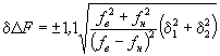 где d1 - погрешность регистрирующего устройства [находится в пределах: для измерителя отношений напряжений ±3 %, для микровольтметра (микроамперметра) ±2 %]; d2 - погрешность, обусловленная нелинейностью характеристики преобразования приемника (находится в пределах ±3 %); d3 - погрешность, обусловленная нестабильностью мощности лазерного излучения (находится в пределах ±5 %); d4 - погрешность, обусловленная неточностью юстировки (находится в пределах ±2 %); d5 - погрешность вольтметра (находится в пределах ±1 %); d6 - погрешность, обусловленная несоответствием коэффициента эллиптичности системы поляризаторов требованиям 5.3.4; 1,96; 1,73; 3 - коэффициенты, зависящие от распределения погрешности измерений и установленной вероятности. Д.5 Погрешность измерения полосы модулирующих частот dDF определяют по формуле