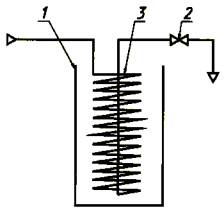 1 - сосуд для охлаждающей смеси; 2 - игольчатый вентиль; 3 - змеевик Рисунок 1 - Устройство для охлаждения сжиженного углеводородного газа Сосуд для охлаждающей смеси с тепловой изоляцией, с размерами под охлаждающий змеевик (внутренний диаметр не менее 100 мм, высота не менее 250 мм). Термометр типа ТН-8 по ГОСТ 400. Термометр ртутный стеклянный по ГОСТ 28498, с пределами градуировки от 0 до 100°С и ценой деления шкалы 1°С. Баня водяная для отстойника с температурой (20±1)°С. Штатив лабораторный для отстойника. Проволока медная диаметром 1,5-2 мм, длиной 200 или 450 мм (в соответствии с высотой отстойника на 100 и 500 см3). Гайка накидная к штуцеру пробоотборника с уплотнительной прокладкой, снабженная металлической или пластиковой трубкой длиной 10-15 см и внутренним диаметром 1-5 мм, служащей для налива сжиженного газа в отстойник. Индикаторы тимоловый синий водорастворимый, ч.д.а., и эозин-Н, ч.д.а. Вата гигроскопическая. Вода дистиллированная (рН = 5,4-6,6) по ГОСТ 6709. Смесь охлаждающая, состоящая из крупнокристаллической поваренной соли и льда, или ацетона и твердого диоксида углерода, или другие смеси, обеспечивающие требуемую температуру. Допускается применять аппаратуру и материалы с аналогичными техническими и метрологическими характеристиками, а также импортные реактивы квалификации не ниже указанной в стандарте. 7.2.2 Проведение испытания 7.2.2.1 На штуцер пробоотборника с испытуемым газом навинчивают накидную гайку с чистой сухой отводной трубкой. Открывая нижний вентиль (у пробоотборника типа ПГО-400 - выпускной вентиль) вертикально расположенного пробоотборника, осторожно наливают сжиженный газ через трубку в чистый сухой отстойник. При наливе конец трубки удерживают под поверхностью заполняющей жидкости, отстойник наполняют до метки 100 см3. Затем в горло отстойника вставляют пробку из ваты, через которую пропускают медную проволоку, доходящую приблизительно до середины мерной части отстойника. Проволока способствует равномерному испарению сжиженного газа, а пробка из ваты не пропускает в отстойник влагу из воздуха. После испарения основной массы и прекращения заметного испарения жидкости отстойник помещают в водяную баню с температурой (20±1)°С и выдерживают 20 мин при этой температуре. Если объем жидкого остатка превышает норму, испытание повторяют с вновь отобранной пробой. 7.2.2.2 При проведении повторных испытаний, а также при разногласиях в оценке качества газа отстойник заполняют сжиженным газом через охлаждающий змеевик. Змеевик устанавливают в сосуд для охлаждающей смеси, охлаждают до температуры на несколько градусов ниже температуры кипения основного компонента пробы и присоединяют к пробоотборнику. Открывая вентили на пробоотборнике и змеевике, промывают змеевик сжиженным газом. Затем отстойник наполняют пробой сжиженного газа, входящей из змеевика, до метки 100 см3, не допуская выброса пробы из отстойника. Далее повторяют операцию испарения газа и измерения количества жидкого остатка. Если в сжиженном газе имеется свободная вода, то после испарения газа она остается на дне и стенках отстойника. При затруднениях в визуальной идентификации свободной воды в жидком остатке ее наличие определяют с помощью водорастворимого красителя. Для этого в отстойник вносят на кончике сухой стеклянной палочки или проволоки несколько кристал