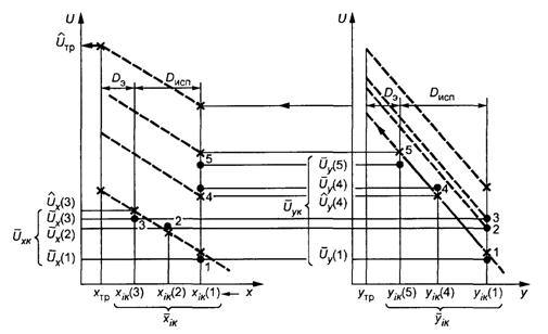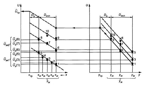 Примечание - Если при построении графиков появляются сомнения в линейности зависимостей U(х), U(у) или U(z) во всем диапазоне испытательных факторов, проводят проверку гипотезы линейности по приложению Д.