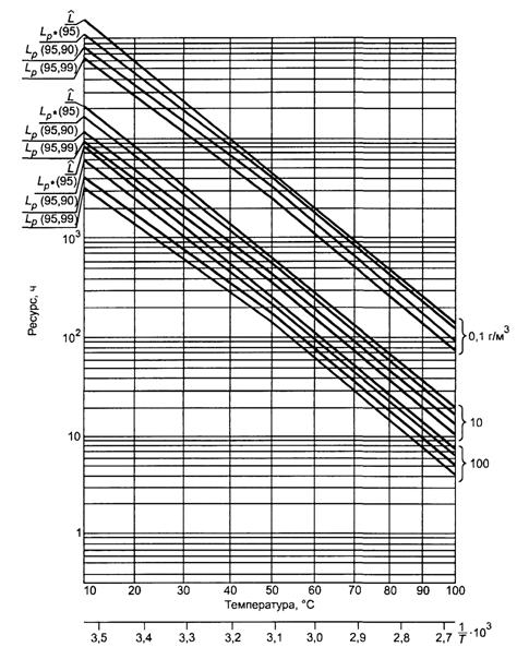Рисунок А.5 - Зависимость ресурса от температуры для проводов ПЭТВ в воздушной среде, содержащей оксиды азота разных концентраций при относительной влажности 100 %, нижние доверительные пределы для Lр (95) и нижние толерантные пределы для различных вероятностей безотказного хранения Lp (95, 90) и Lp (95, 99)