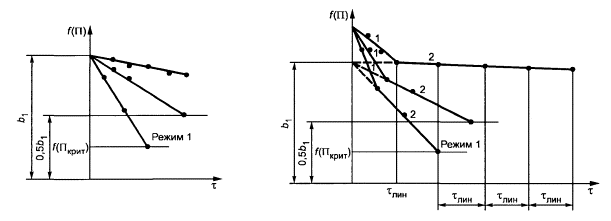 8.15. Испытания по методу I являются предпочтительными. 8.16. Испытания по методу II можно проводить в следующих случаях, указанных в 8.16.1 и 8.16.2. 8.16.1. Если заранее известно, что математическая функция зависимости значения параметра-критерия отказа от продолжительности воздействия испытательных факторов может быть представлена прямой линией. 8.16.2 Если невозможно проводить испытания по методу I, в этих случаях экспериментальным путем находят приближенную математическую функцию зависимости параметра-критерия отказа от продолжительности воздействия испытательных факторов и представляют ее в виде прямой линии. 8.16.3. При испытаниях применяют метод, указанный в приложении А. 8.17. Испытания по методу III являются комбинацией методов I и II. Метод допускается применять с целью сокращения общей продолжительности испытаний в случаях, когда ожидается (но окончательно не подтверждено), что зависимость математической функции параметра-критерия отказа f(П) от продолжительности может быть представлена в виде прямой линии (например, если за критерий отказа принят пробой, или при воздействии испытательного электрического напряжения). Испытания проводят следующим образом. 8.17.1. В наиболее жестких режимах (не менее чем при двух значениях испытательных факторов в каждой серии испытаний) испытания проводят по методу I. 8.17.2. В слабых режимах каждой серии испытания проводят в следующем порядке: а) для испытаний по соответствующему режиму применяют удвоенное число образцов; б) через 15 - 20 % ожидаемого срока L определяют значение f(П) у половины испытуемых образцов (или отдельно элементов конструкции) и вычисляют среднее этих значений (например, среднее логарифмов значений пробивных электрических напряжений); в) если у оставшихся образцов не наступили отказы, то спустя 40 - 60 % ожидаемого срока L определяют значения f(П) у половины оставшихся образцов и вычисляют среднее этих значений; г) по полученным данным в масштабе f(П) от продолжительности (τ) проводят экстраполяцию по продолжительности до критического значения критерия отказа и прогнозируют средний срок в этом режиме, при этом на график наносят среднее значение f(П). Здесь f(П) - функция параметра-критерия отказа (например, lg 1/и, где и - значение пробивного напряжения); τ - суммарная продолжительность воздействия испытательной среды во всех проведенных циклах испытаний; д) определяют средний срок L в данном режиме по результатам двух других режимов каждой серии испытаний путем линейной экстраполяции соответственно в масштабе: lg L - lg С или lg L - lg η или lg L - 1/Т; е) сравнивают средние сроки L, определенные по перечислениям г и д; ж) если между сроками (перечисление е) различия несущественны, определяют значение f(П) оставшихся образцов и по этим данным уточняют средний прогнозируемый срок в данном режиме. Этот срок принимают для расчетов по разделу 6 настоящего стандарта; з) если между сроками (перечисление е) различия существенны, то испытания оставшихся образцов продолжают до наступления отказа в режиме испытания. Полученные при этом сроки L принимают для расчета по разделу 9 настоящего стандарта; и) линейную экстраполяцию по перечислениям г и д проводят при помощи метода наименьших квадратов с определением дисперсии по срокам L; сравнение сроков по перечислению е проводят при помощи дисперсионного анализа с и