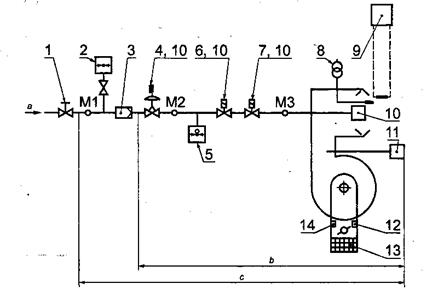 1 - ручной отсечной клапан; 2 - манометр для измерения давления газа; 3 - фильтр; 4 - регулятор давления газа; 5 - устройство контроля давления газа; 6 - предохранительное отсечное устройство; 7 - управляющее устройство; 8 - устройство зажигания; 9 - датчик контроля пламени; 10 - устройство предварительной настройки; 11 - устройство контроля вентилятора; 12 - позиционный переключатель низкого расхода воздуха; 13 - предохранительное устройство для вращающихся деталей, например решетка; 14 - позиционный переключатель высокого расхода воздуха; M1 - точка измерения давления на входе; М2 - точка измерения для регулирования давления; М3 - точка измерения в головке горелки; а - топливный газ; b - минимальное оборудование для типового испытания; с - оборудование горелки Рисунок 1 - Минимальное оборудование газовой горелки с принудительной подачей воздуха