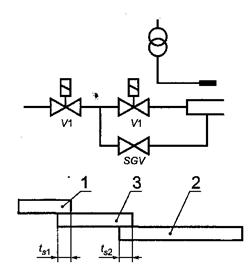 V1 - основной предохранительный газовый отсечной клапан; SGV - предохранительный отсечной клапан подачи пускового газа; tsl - первое время безопасности; ts2 - второе время безопасности; 1 - зажигание; 2 - основная горелка; 3 - пусковой газ Рисунок 2с - Прямое зажигание основной горелки при пониженном расходе с независимой подачей пускового газа