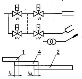V1 - основной предохранительный газовый отсечной клапан; PV - предохранительный отсечной клапан запальной горелки; ts1 - первое время безопасности; ts2 - второе время безопасности; 1 - зажигание; 2 - основная горелка; 4 - пилот Рисунок 2d - Зажигание основной горелки с независимой запальной горелкой
