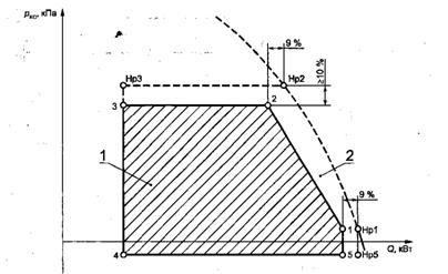 1 - рабочая диаграмма; 2 - испытательная диаграмма Рисунок 3 -Рабочая и испытательная диаграммы для одноступенчатой горелки (точки Нр3 и Нр5 не определены)