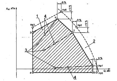 1 - рабочая диаграмма; 2 - испытательная диаграмма; 3 - точки минимальной рабочей мощности; 4 - точки промежуточной мощности Рисунок 4 - Рабочая и испытательная диаграммы для двухступенчатых, многоступенчатых и модулирующих горелок (точки Нр3 и Нр5 не определены)