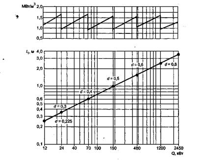Рисунок 6 - Зависимость интенсивности сжигания, диаметра и длины испытательной жаровой трубы от тепловой мощности