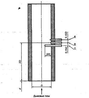 а - температура; b - разрежение/давление; с - анализ дымовых газов; d - задняя стенка испытательной жаровой трубы Рисунок 7 - Узел измерения дымового газа (измерительные трубки могут быть расположены в шахматном порядке) ПРИЛОЖЕНИЕ А