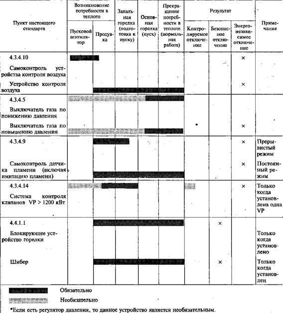 Если основное пламя устанавливается посредством запального пламени, пусковой газ должен подаваться при следующих условиях: - под контролем предохранительного отсечного клапана основного газа по направлению потока, включая положение ограничения пускового газа, или - под контролем предохранительных отсечных клапанов согласно таблице 1. 4.3.4.8 Устройство для зажигания Устройство для зажигания обеспечивает безопасное зажигание запальной горелки и (или) основной горелки при заданных условиях эксплуатации. 4.3.4.9 Устройство контроля пламени Основное пламя и пламя любой запальной горелки подлежат контролю с помощью устройства контроля пламени. Установка датчиков пламени на горелки должна быть такой, чтобы они не воспринимали никакой посторонний свет. Там, где запальная и основная горелки снабжены (каждая) отдельным собственным устройством контроля пламени, пламя запальной горелки не должно оказывать влияния на контроль основного пламени. Источник подачи основного газа должен открываться только после отключения устройства для зажигания запальной горелки при условии появления устойчивого пламени запальной горелки и установления стабильного контроля наличия этого пламени. Для систем, где запальная горелка остается в действии во время работы основной горелки, должны быть установлены раздельные датчики пламени с целью контроля запального и основного пламени. Датчик основного пламени должен быть расположен так, чтобы он ни при каких обстоятельствах не мог контролировать пламя запальной горелки. Для систем, в которых запальная горелка гаснет во время работы основной горелки, будет достаточно одного датчика. Пламя запальной горелки не должно влиять на контроль основного пламени. Устройство контроля пламени должно быть таким, чтобы в случае погасания пламени не наблюдалась заметная задержка между погасанием пламени и прекращением сигнала о наличии пламени. Устройство контроля пламени должно функционировать при любой тепловой мощности в пределах диапазона регулирования и при любом режиме работы горелки. При монтаже на горелке оно должно соответствовать категории защиты не менее IP40 и не менее ТР54 для установок на открытом воздухе согласно ГОСТ 14254-96. Устройство контроля пламени должно обуславливать безопасное выключение или энергонезависимое выключение, если датчик сигнализирует о появлении пламени в любой период времени при предварительной продувке. Это представляет собой проверку безопасного пуска. Данная проверка может прекратиться за 5 с до попытки воспламенения. При наличии кажущегося пламени должно произойти энергонезависимое отключение. Время безопасности при отключении отсечных клапанов при исчезновении пламени должно составлять не более 1 с при нормальном режиме работы и не более 2 с в тех случаях, когда испытание на самоконтроль проводят одновременно с исчезновением пламени. 4.3.4.10 Устройство контроля воздуха Горелка должна быть оснащена устройством контроля адекватного воздушного потока во время предварительной продувки, зажигания и работы горелки. Прекращение потока воздуха в любой момент при предварительной продувке, зажигании или работе горелки должно вызвать энергонезависимое отключение. Для горелок тепловой мощностью до 120 кВт включительно допускается безопасное отключение после един