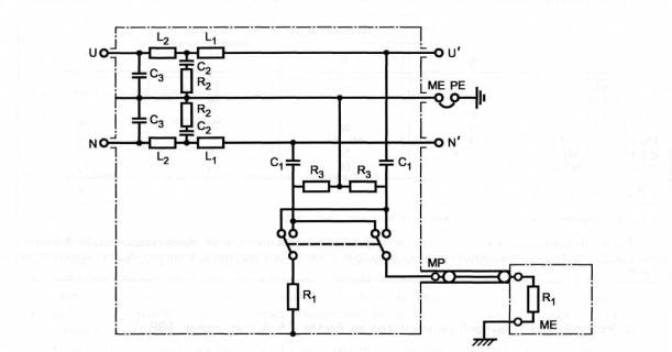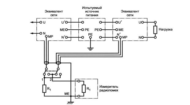 4. Устройства с потребляемым током более 25 А, но менее 100 А4.1. Метод испытанийСхема эквивалента сети для устройства с потребляемым током до 100 А приведена на рисунке 1. Эквивалент сети должен использоваться с измерителем радиопомех, имеющим входное сопротивление 50 Ом. Измерения проводят в соответствии с 3.2 с использованием измерительной установки, приведенной на рисунке 2. 4.2. НормыДопустимые уровни радиопомех на входных зажимах устройства должны соответствовать установленным в 3.3. Допустимые уровни радиопомех на выходных зажимах должны быть установлены в технической документации на устройство по согласованию между изготовителем и пользователем. ME - измерительное заземление; РЕ - защитное заземление; МР - точка измерений