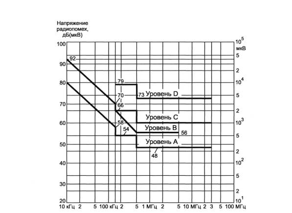 3.2. Метод испытанийИспытуемое устройство должно быть подсоединено к электрической сети через эквивалент сети для обеспечения определенного полного сопротивления на входных зажимах в точке замера напряжения радиопомех, а также для защиты устройства от радиопомех по цепям электропитания. На рисунке 1 приведена общая схема измерения напряжений радиопомех между каждым из проводников и заземлением. Измерения напряжений радиопомех на выходных зажимах проводят с нагрузкой, применяемой в условиях эксплуатации устройства. Если такие прямые измерения невозможны или в случае, когда нагрузка ведет себя как индуктивное сопротивление, рекомендуется вводить между указанной нагрузкой и устройством дополнительный эквивалент сети по схеме рисунка 1. Допускается проводить измерения напряжения радиопомех на выходных зажимах устройства при указанной нагрузке без дополнительного эквивалента сети с применением пробника напряжения по ГОСТ Р 51319 (тип 2). Эквивалент сети при токе, потребляемом устройством, не более 25 А должен удовлетворять требованиям ГОСТ Р 51319 (тип 1). Подробная схема подключения измерителя радиопомех к испытуемому устройству приведена на рисунке 2. Напряжения радиопомех измеряются последовательно на входных и выходных зажимах устройства. Для того, чтобы определить условия, при которых имеет место максимальный уровень радиопомех, измерения должны выполняться при питающих напряжениях в пределах установленного диапазона питания и во всем установленном диапазоне нагрузки (см. также ГОСТ Р 51320). Испытания на соответствие требованиям настоящего стандарта проводят при нормальных климатических условиях: температуре окружающего воздуха (25±10) °С; относительной влажности воздуха 45-80 %; атмосферном давлении 84-106,7 кПа (630-800ммрт. ст.). 3.3. НормыПрименительно к условиям испытаний, определенным в 3.1 и 3.2, устанавливают четыре группы (А, В, С, D) предельно допустимых уровней (норм) напряжений радиопомех, создаваемых устройством на входных и выходных зажимах, приведенных в таблице 2: уровни А и С относятся к полосе частот 10 кГц-30 МГц; уровни В и D относятся к полосе частот 150 кГц-30 МГц. В технической документации на устройство конкретного типа должно быть указано, какой из уровней применяется к входным зажимам, а какой - к выходным. Нормы радиопомех, указанные в таблице 2, приведены в графическом виде на рисунке 3 Таблица 2-Нормы