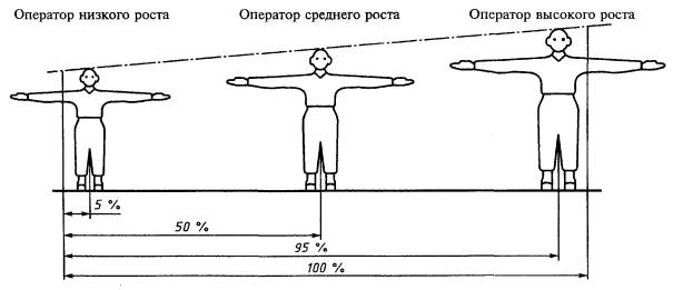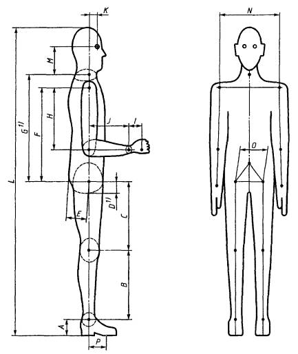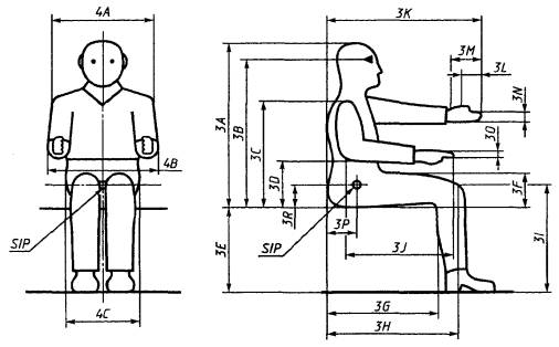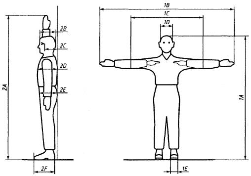 Все размеры, приведенные в таблицах 1 - 4, указаны для операторов в выпрямленном положении. В нормальном положении тело человека как бы дает осадку и результаты измерений в этом случае будут несколько заниженными: значения роста (1А) и предела досягаемости с поднятой рукой (2A) будут занижены приблизительно на 15 мм, а высота в положении сидя (3А) и высота расположения глаз (3В) в положении сидя будут занижены примерно на 25 мм. Таблица 3 В миллиметрах