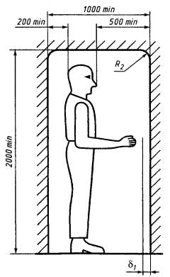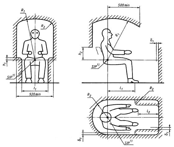 5 Минимальное рабочее пространство вокруг оператора5.1 Минимальное рекомендованное рабочее пространство вокруг оператора в спецодежде, ограниченное внутренними размерами кабины и устройствами ROPS, FOPS, приведено на рисунке 5 для оператора в положении сидя и на рисунке 6 для оператора в положении стоя. Размеры приведены относительно контрольной точки сиденья (SIP) согласно требованиям ГОСТ 27715. 1) SIP - контрольная точка сиденья. Рисунок 5 - Минимальное рабочее пространство вокруг оператора в спецодежде для работы в положении сидя, ограниченное внутренними размерами кабины и устройствами ROPS, FOPS Примечание - Размеры - по таблице 4. Рисунок 6 - Минимальное рабочее пространство вокруг оператора в спецодежде для работы в положении стоя, ограниченное внутренними размерами кабины и устройствами ROPS, FOPS Примечание - Размеры d1 и R2 - по таблице 4. Размеры рабочего пространства по ширине и зазор для ножных органов управления соответствуют указанным на рисунке 5. Очертание рабочего пространства не определяет форму кабины и устройств ROPS, FOPS. Допускаются изменения минимального рабочего пространства вокруг оператора для конкретных машин. 5.2 Минимальное рабочее пространство вокруг оператора указано с учетом антропометрических данных оператора высокого роста, приведенных на рисунках 2 и 3, и измеряется по внутренней поверхности кабины и устройств ROPS, FOPS, не имеющих видимых следов деформации. 5.3 Минимальное рабочее пространство вокруг оператора может быть меньше указанного на рисунках 5 и 6, если установлено, что уменьшение рабочего пространства вокруг оператора при работе на конкретных землеройных машинах повышает эффективность его работы. Возможные изменения рабочего пространства вокруг оператора приведены ниже: 5.3.1 Минимальная высота рабочего пространства вокруг оператора, равная 1050 мм относительно SIP, рекомендуется для размещения широко используемых сидений и обеспечения зазора для защитного шлема оператора. Минимальная высота ограждения вокруг рабочего пространства может быть уменьшена до 1000 мм относительно SIP в случаях, когда оператор не пользуется защитным шлемом (ГОСТ 27715). 5.3.2 Высота рабочего пространства может быть изменена для следующих разновидностей конструкций сидений: для сиденья без вертикальной подвески - уменьшена на 40 мм; для сиденья без вертикального регулирования высоты - уменьшена на 40 мм; для сиденья с регулируемой спинкой - регулировкой спинки на угол более 15°. 5.4 Положение оператора может быть смещено от осевой линии рабочего пространства в направлении прямой видимости боковой поверхности землеройной машины при условии, что минимальное расстояние от SIP до внутренней боковой поверхности составляет не менее 335 мм. 5.5 В конструкции некоторых типов землеройных машин может быть предусмотрена возможность использования рабочего пространства меньшего размера, чем установлено в настоящем стандарте. Для таких машин минимальная ширина внутреннего пространства может быть уменьшена до 650 мм. При минимальной ширине пространства должно быть предусмотрено расположение органов управления, обеспечивающее эффективную работу и комфорт оператора. 5.6 Если оператор при работе с органами рулевого управления или для доступа к органам управления, расположенным сзади SIP, наклоняется вперед, минимальный зазор между задней стенкой 