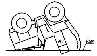 Рисунок 2 - Проникновение вертикальной имитируемой плоскости грунта VSGP в DLV Примечание - VSGP применяют только при установке защитных стоек ROPS. 4 Условные обозначенияВ настоящем стандарте применяют следующие условные обозначения и сокращения: 4.1 U- энергия, поглощаемая ROPS, зависящая от массы машины, Дж. 4.2 F- усилие, Н. 4.3 М - максимальная масса машины, рекомендуемая изготовителем, кг. Примечания 1 Максимальная масса машины, рекомендуемая изготовителем - масса машины в рабочем состоянии с полной заправкой всех емкостей, с учетом массы рабочего оборудования, инструмента и устройства ROPS, но без учета прицепного оборудования, например катков, уплотняющих машин и прицепных скреперов. 2 При испытаниях самоходных скреперов и землевозов с шарнирно-сочлененной рамой в массу М входит также масса тягача и опорной части ROPS. Поворотные шкворни, сцепные приспособления и элементы шарнирно-сочлененного управления, которые крепятся к сцепным приспособлениям или прицепным устройствам, не входят в массу указанных машин. 3 При испытании землевозов с жесткой рамой в массу М не входит масса кузова и масса номинального груза, если объектом испытаний является только устройство ROPS. Если объектом испытаний является весь корпус машины, в массу М включают массу кузова без номинального груза. 4 При испытании катков и других уплотняющих машин, содержащих засыпной балласт, его не включают в массу М. Прилипающие или попадающие на машину в процессе работы почву, грязь, камни, ветви и т. п. не следует рассматривать как часть массы машины. Обрабатываемый материал, транспортируемый или удерживаемый любым способом, не следует рассматривать как часть массы машины при проведении испытаний. 4.4 L - длина ROPS, мм. Примечания 1 Для одно- или двустоечных ROPS с FOPS и(или) консольных конструкций длина L является той их частью, которая накрывает проекцию длины DLV на горизонтальную плоскость и измеряется в верхней части ROPS от крайней передней (лицевой) стойки ROPS до наиболее удаленного конца консольных элементов (рисунок 3). 2 Для других ROPS длина L - наибольшее продольное расстояние между наружными сторонами передней и задней стоек (рисунок 4).