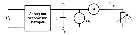 U1, - напряжение питания; U2 - выходное напряжение; I2, - выходной ток; А - амперметр; V - вольтметр; R - переменный резистор; T1, и Т2 - зажимы выходной цепи зарядного устройства батарей; С - конденсатор емкостью Е в фарадах, рассчитываемой по формуле