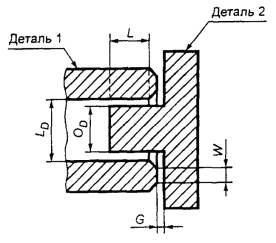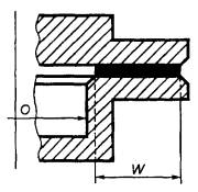 Примечание - При ширине соединений от 5 до 22 мм максимальный промежуток может быть увеличен на 0,01 мм на каждый миллиметр увеличения ширины соединения св. 5 мм. 13.1.2. Цилиндрические соединения (рисунок 3), которые имеют осевую L и радиальную W части соприкосновения, каждая из которых должна быть не менее 1,2 мм, могут иметь диаметральные промежутки, как указано для плоских соединений в таблице 2. Радиальная часть цилиндрического соединения должна иметь максимально допустимый промежуток, как указано для плоских соединений в таблице 2. Рисунок 3 - Цилиндрическое соединение 13.1.3. Для соединения с прокладкой (рисунок 4) требования указаны в таблице 3. Рисунок 4 - Соединение с прокладкой Таблица 3 - Соединения с прокладкой В миллиметрах
