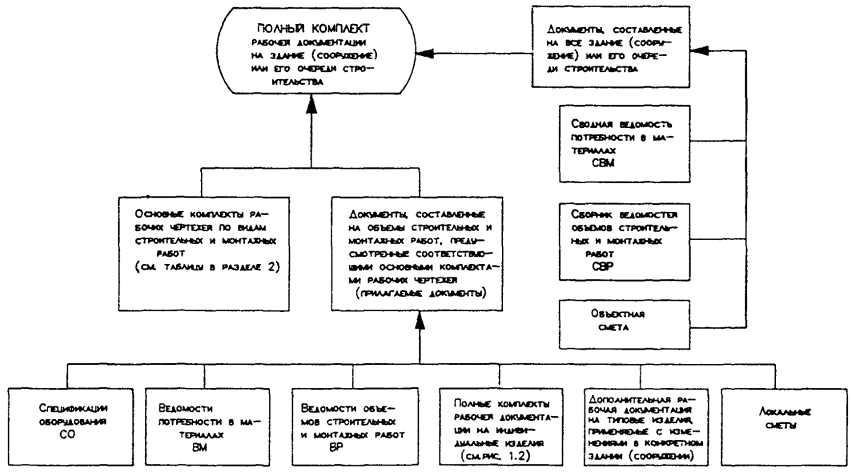 Примечание. В состав рабочей документации могут входить другие виды документов, необходимые для осуществления строительных и монтажных работ, например, опросные листы, эскизные чертежи общих видов нетиповых технологических конструкций. *Технические условия разрабатывают при отсутствии стандартов технических условий, распространяющихся на данные изделия, а также при необходимости дополнения или ужесточения требований, установленных в этих стандартах. Рабочая документация для строительства должна выдаваться заказчику комплектно. При этом состав рабочей документации в каждом конкретном случае устанавливается при заключении договоров (контрактов) между заказчиком и исполнителем работ. Полный комплект рабочей документации на здание (сооружение) или его очереди строительства включает в себя: основные комплекты рабочих чертежей по видам работ; текстовые документы, выполненные к соответствующим основным комплектам рабочих чертежей; полные комплекты рабочей документации на строительные изделия, предусмотренные соответствующими основными комплектами рабочих чертежей; текстовые документы на здание (сооружение) в целом или на его очередь строительства. Для производства строительных и монтажных работ заказчику должны выдаваться основные комплекты рабочих чертежей с прилагаемыми к ним рабочими документами: спецификацией оборудования, ведомостью потребности в материалах, ведомостью объемов строительных и монтажных работ, рабочей документацией на индивидуальные строительные изделия, дополнительными рабочими чертежами, содержащими изменения типовых изделий, применяемых в конкретном здании (сооружении); локальной сметой и др. Стандарты, содержащие рабочие чертежи изделий, стандарты технических условий, рабочая документация на типовые конструкции, изделия и узлы, а также расчеты проектной организацией заказчику не выдаются. Расчеты хранят в техническом архиве организации, разработавшей соответствующую рабочую документацию, и могут быть представлены заказчику во временное пользование по его просьбе. Пример построения полного комплекта рабочей документации, выдаваемого заказчику, на здание (сооружение) или его очередь строительства приведен на рис. 1.1. При комплектовании рабочих документов на изделие следует различать: основной рабочий документ; основной комплект рабочих документов; полный комплект рабочих документов. Основной рабочий документ изделия в отдельности или в совокупности с другими записанными в нем рабочими документами полностью и однозначно определяют данное изделие и его состав. Основными рабочими документами изделия являются: для деталей - чертеж детали; для сборочных единиц - спецификация. Основной комплект рабочих документов изделия объединяет рабочие документы, относящиеся ко всему изделию. В него включают спецификацию, сборочный чертеж, чертежи деталей и, при необходимости, технические условия. Рабочие документы составных частей в основной комплект документов изделия не входят. Полный комплект рабочих документов изделия включает в себя: основной комплект рабочих документов на данное изделие; основные комплекты рабочих документов на все составные части данного изделия, примененные по своим основным рабочим документам. Пример построения полного комплекта рабочих документов