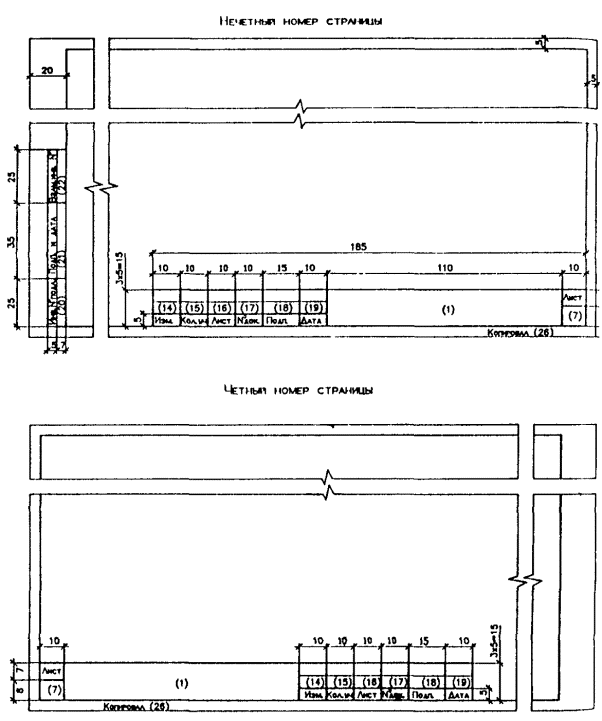 ОСНОВНАЯ НАДПИСЬ И ДОПОЛНИТЕЛЬНЫЕ ГРАФЫ К НЕЙ ДЛЯ ЧЕРТЕЖЕЙ ИЗДЕЛИЙ И ТЕКСТОВЫХ ДОКУМЕНТОВ (ПОСЛЕДУЮЩИЕ ЛИСТЫ) Рис. 1.19 На документах, состоящих из одного листа, графу не заполняют: в графе 8 - общее количество листов документа. Графу заполняют только на первом листе. На первом листе текстового документа при двусторонней печати указывают общее количество страниц; в графе 9 - наименование или различительный индекс организации, разработавшей документ; в графе 10 - характер работы (разработал, проверил, нормоконтроль и т.п.), а также должности лиц, ответственных за выпуск документа (например, главный инженер (архитектор) проекта, начальник отдела, главный специалист); в графах 11 - 13 - фамилии и подписи лиц, указанных в графе 10, и дату подписания. Порядок подписания рабочих чертежей устанавливается проектной организацией. Если необходимо согласование документа, то подписи должностных лиц, согласовывающих документ, размещают на поле для подшивки листа (графы 10 - 13). На последующих листах чертежей изделий и текстовых документов графы согласования не приводят: в графах 14 - 19 - графы таблицы изменений, которые заполняют в соответствии с разделом 6; в графе 20 - инвентарный номер подлинника; в графе 21 - подпись лица, принявшего подлинник на хранение, и дату приемки (число, месяц, год); в графе 22 - инвентарный номер подлинника документа, взамен которого выпущен подлинник; в графе 23 - обозначение материала детали (графу заполняют только на чертежах деталей); в графе 24 - массу изделия, изображенного на чертеже, в килограммах без указания единицы измерения. Допускается указывать массу в других единицах измерения с указанием их, например: 2,4 т; в графе 25 - масштаб изображения; в графе 26 - подпись лица, копировавшего чертеж. Расположение основной надписи и дополнительных граф к ней приведены на рис. 1.20. Расположение основной надписи и дополнительных граф к ней для текстовых документов при двустороннем копировании приведены на рис. 1.21. РАСПОЛОЖЕНИЕ ОСНОВНОЙ НАДПИСИ, ДОПОЛНИТЕЛЬНЫХ ГРАФ К НЕЙ И РАЗМЕРЫ РАМОК НА ЛИСТАХ Рис. 1.20 ОСНОВНАЯ НАДПИСЬ И ДОПОЛНИТЕЛЬНЫЕ ГРАФЫ К НЕЙ ДЛЯ ТЕКСТОВЫХ ДОКУМЕНТОВ ПРИ ДВУСТОРОННЕМ СВЕТОКОПИРОВАНИИ (ПОСЛЕДУЮЩИЕ ЛИСТЫ) Рис. 1.21 2. ОСНОВНОЙ КОМПЛЕКТ РАБОЧЕЙ ДОКУМЕНТАЦИИ2.1. Общие положенияОсновной комплект рабочих чертежей, как правило, объединяет несколько рабочих чертежей одного вида работ, содержащих общие данные по рабочим чертежам, схемы и планы расположения элементов конструкции, оборудования со спецификациями, а также другие графические изображения и текстовые указания. Например, основной комплект рабочих чертежей железобетонных конструкций может объединять рабочие чертежи фундаментов, каркаса, перекрытий, покрытий и других железобетонных конструкций здания или сооружения. Полный состав и содержание рабочих чертежей, входящих в тот или иной основной комплект, определяются видами работ, для выполнения которых они разработаны. Независимо от количества рабочих чертежей, включенных в основной комплект, его следует рассматривать как единый документ. Все листы в пределах основного комплекта рабочих чертежей должны иметь сквозную нумерацию, присвоенное ему обозначение и подписи лиц, разработавших документ и ответственных за его выпуск. Каждому основному комплекту рабочих чертежей присваивают марку. Марки должны соотв