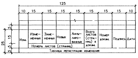 В этом случае на первом листе должно быть внесено изменение в общее количество листов. В текстовых документах, содержащих в основном сплошной текст (например, технические условия, общие указания, технические требования), допускается при добавлении нового пункта присваивать ему номер предыдущего пункта с добавлением очередной строчной буквы русского алфавита, например: 3а; при аннулировании пункта - сохранять номера последующих пунктов. В текстовых документах рекомендуется предусматривать таблицу регистрации изменений (ТР) и размещать ее на титульном листе. Форма ТР приведена на рис. 6.13. В графах таблицы регистрации изменений должно быть указано: в графах «Изм.», «№ докум.», «Подп.» и «Дата» - аналогично заполнению соответствующих граф таблицы изменений; в графах «Номера листов (страниц): измененных, замененных, новых, аннулированных» - номера листов (страниц) соответственно измененных, замененных, добавленных и аннулированных по данному разрешению. ФОРМА ТАБЛИЦЫ РЕГИСТРАЦИИ ИЗМЕНЕНИЙ