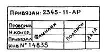 Примеры заполнения штампов привязки приведены на рис. 7.3 и 7.4. В графах штампа привязки указывают: в графе 1 - новое обозначение документа, соответствующее проектируемому объекту. Например: «Привязан: 2345-11-АР», или «Привязан: 2145-11-КЖ.И22»; в графе 2 - наименование организации, выполнившей привязку; в графе 3 - наименование проектируемого предприятия, здания или сооружения, для которого выполнена привязка; в графе 4 - характер выполненной работы (привязал, проверил, нормоконтролер) или должности (ГИП, начальник отдела и т.п.); в графе 5 - фамилии лиц, подписавших лист после их привязки; в графе 6 - подписи лиц, указанных в графе 5; в графе 7 - даты подписания; в графе 8 - инвентарный номер, присвоенный привязанному документу; в графе 9 - количество листов привязанной документации; в графе 10 - подпись лица, принявшего привязанный документ на хранение; в графе 11 - дату подписания лицом, указанным в графе 10. На дополнительных и замененных (выпущенных вместо аннулированных) листах взамен штампа привязки следует наносить основные надписи и дополнительные графы к ним по формам и правилам их заполнения, приведенным в подразд. 1.4. ПРИМЕР ЗАПОЛНЕНИЯ ШТАМПА ПРИВЯЗКИ НА ПОСЛЕДУЮЩИХ ЛИСТАХ ДОКУМЕНТА