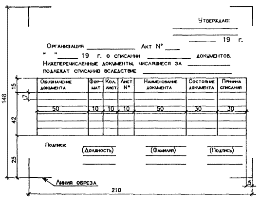 Выдачу подлинников документов для восстановления следует производить по специальному распоряжению руководителя (или его заместителя) организации-держателя подлинников документов. Подлинники аннулированных (в т.ч. аннулированных с заменой) документов (листов документов) следует хранить отдельно от подлинников действующих документов. 8.2. Восстановление подлинниковПришедшие в негодность или утерянные подлинники документов по решению руководителя (или его заместителя) организации-держателя подлинников могут быть восстановлены. До восстановления подлинника документа должен быть составлен акт о списании пришедшего в негодность или утерянного подлинника документа (рис. 8.11). Акт должен быть утвержден руководителем организации-разработчика или его заместителем. Восстановленные подлинники документов действуют также, как замененные подлинники. Изменения в восстановленный подлинник документа вносят на основании всех разрешений на внесение изменений, выданных до момента его восстановления. Подлинник документа восстанавливают без оформления разрешения. Восстановление подлинника следует производить репрографическим способом, вручную, перепечаткой на пишущей машинке или с помощью печатающих средств вывода ЭВМ. Восстановленный подлинник документа должен по своему техническому содержанию представлять точную копию восстанавливаемого подлинника документа. В подлиннике документа, восстановленном путем перекопирования, не воспроизводят размеры, надписи, графические изображения, зачеркнутые в соответствии с разрешением на внесение изменений в подлиннике (или копии), с которого снимается восстановленный подлинник. В первую снизу строку таблицы изменений каждого листа восстановленного подлинника документа, изготовленного вручную, переносят запись только о последней замене или последнем изменении данного листа. Подписи, визы и даты, имеющиеся на восстанавливаемом подлиннике документа (в том числе и таблицах изменений), в восстановленном подлиннике документа, изготовленном вручную, вписывают чертежным шрифтом и заключают в круглые скобки. Взамен неразборчивых подписей в круглых скобках пишут слово «Подпись». АКТ О СПИСАНИИ ДОКУМЕНТОВ