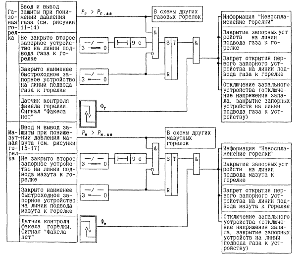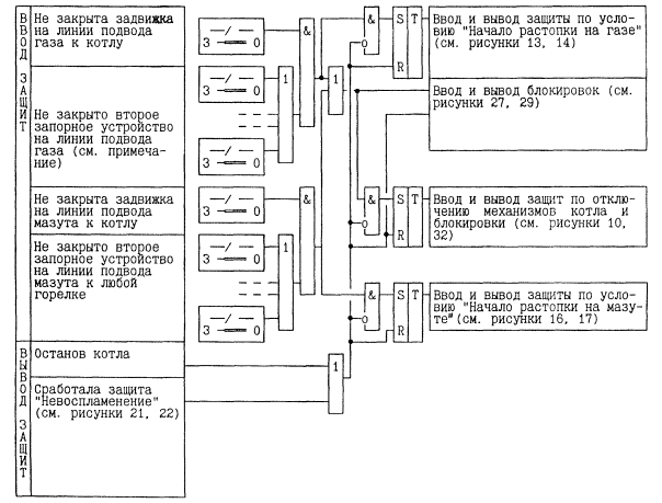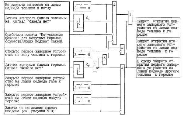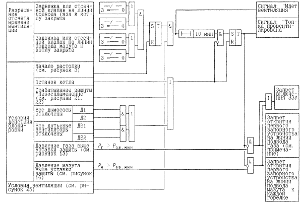 Рисунок 34 - Блокировки запорного устройства на трубопроводе безопасности газовой горелки. Блокировки паровой и мазутной магистралей мазутной горелки