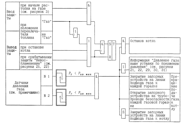 Примечание - Для котлов с ПЗК: «Запрет открытия первого запорного устройства на линии подвода газа к каждой горелке». Для котлов без ПЗК: «Запрет открытия первого запорного устройства на линии подвода газа к каждой горелке растопочной группы».