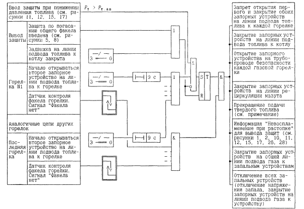 Рисунок 21 - Защита «Невоспламенение первой или погасание факела всех газовых горелок, оснащенных ПЗК и ЗЗУ, или всех мазутных горелок, оснащенных ЗЗУ, при розжиге котла». Газомазутный и пылегазовый котлы