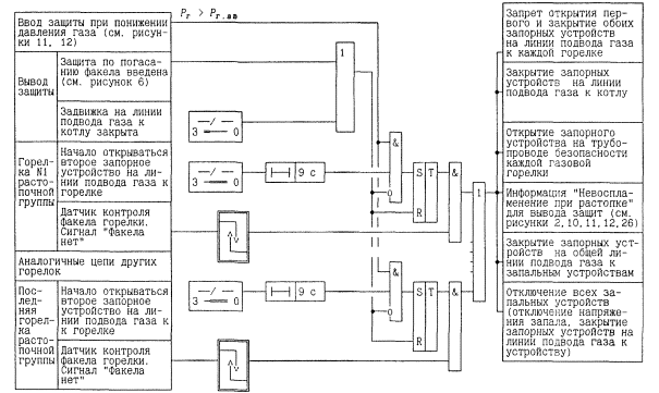 2 Для котлов с ПЗК: «Запрет открытия первого запорного устройства на линии подвода газа к каждой горелке». Для котлов без ПЗК: «Запрет открытия первого запорного устройства на линии подвода газа к каждой горелке растопочной группы».